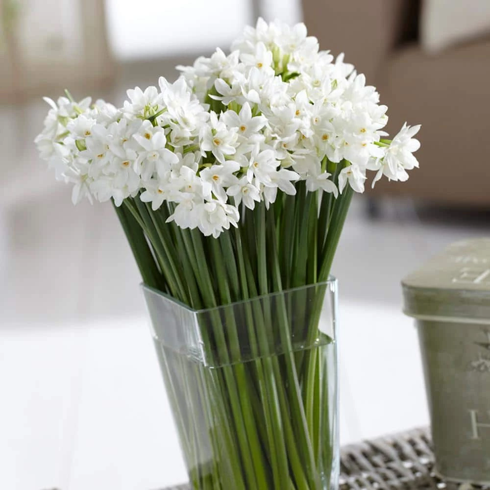 Paperwhites are non-hardy tazetta daffodils that can be forced and grown inside the home without any cold exposure, special handling, or treatment. Fun and easy to grow in pots, on water and/or a favorite vessel. Timeless beauty, sweet perfume, and absolute dependability have made Paperwhites Narcissus the absolute all-time favorite bulb for indoor forcing in winter. Clusters of pure white blooms will come 4-6 weeks after potting. Very easy to grow, no special handling or treatment is required. Each bulb is so huge that it will likely grow 3 to 4 stems PER bulb. Due to their size, they are best spaced further apart than normal, thus requiring fewer bulbs per planting vessel. Truly unique and not commonly available at local nurseries nor box stores in this special bulb size. A Van Zyverden special offer. Pot Paperwhites as soon as you receive them, or store them in a warm, dry place until you are ready to plant. Yes, this is quite the contrary to how regular daffodils should be handled. They are best rooted at cooler temperatures, below 60F. Once rooted, a somewhat warmer house temperature is preferred. But not too hot or too dry an environment, as it may hinder flowering. Also, the less light they receive, the taller they will grow.