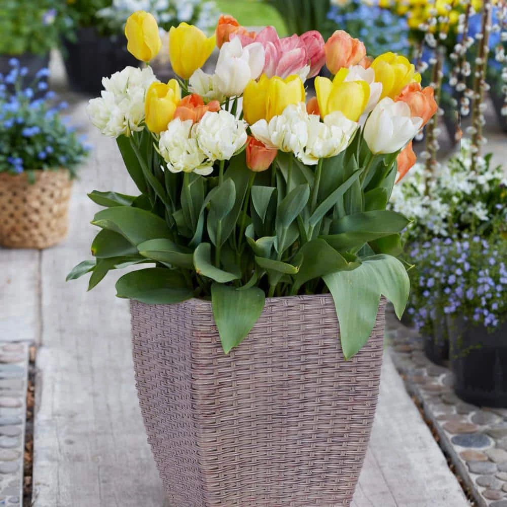 You may have limited space, or not have a garden at all, or simply prefer pot culture as this makes plants easier to care for. As long as you have a little space for a medium sized container on your porch, deck, patio and/or balcony you can garden. Our transitional styled decorative rattan planter ( sized 12 in. x 12 in. x 16 in. ), comes with a hard-shell inner plastic growing pot, bag(s) of medium, planting stock, gardening gloves and growing directions. Tulips are the indispensable blooms of the spring landscape, as they bring it to life. Tulips are suitable for a wide range of plantings and make for great container plants. Flowers are upward facing, with linear to lance-shaped green leaves on the stem. To assure an impressive display we include 25 Emperor type tulips consisting of varieties. Purissima, Yellow Empress, Orange Emperor and Pink Emperor.
