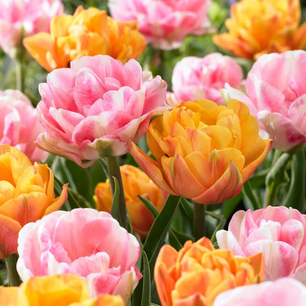 Tulips are the indispensable blooms of the spring garden, as they bring it to life. They are unique in the range of size, shape and bold color found in almost every color spectrum, that only tulips provide. Tulips are suitable for a wide range of plantings, are excellent in the rock garden, in formal beds, as elegant cut flowers and for containers. They can be used in nearly any garden design scheme. Flowers are upward facing, with linear to lance-shaped green leaves on the stem. Tulip descriptions can become quite technical, as they are grouped into 15 different divisions, describing the petals, stamens and leaves in detail. Plant several different varieties of tulips throughout the garden to extend the blooming time. This Double Blossom Tulip blend consists of a combination of Freeman and Orange Angelique tulip varieties. It makes for a picture perfect pairing.
