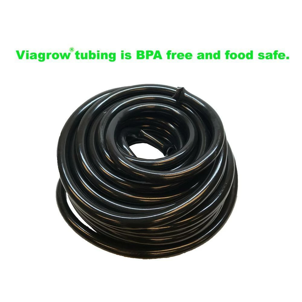 Viagrow Food Grade Multipurpose tubing can be used for irrigation lines, Beer Line, Kegerator, Wine Making, Airline Tubing for Aquarium application. Viagrow Food grade PVC hose can be used in hydroponics, aquaponics, DWC ( Deep Water Culture ) hydroponic kits and is great for grow rooms and green houses and our 1/2 in. and 3/4 in. tubing will accommodate most ebb and flow or flood and drain hydroponic kits. The Viagrow multipurpose food grade tubing is available in 100 ft. roles and the following sizes: Part number V708215: 3/16in ID – 1/4in OD clear tubing Working pressure psi 43.5 Working temp -5-65C/23-149F Part number V708265: 1/2 in. ID – 5/8in OD black food grade PVC tubing Working pressure psi 58, 43.5 Working temp -5-65C/23-149F Part number V708201: 1/2in ID-5/8in OD translucent blue tubing Working pressure psi 58, 43.5 Working temp -5-65C/23-149F Part number V708245: 3/4in ID – 1 in. OD, black food grade PVC tubing Working pressure psi 43.5, 43.5 Working temp -5°C to 65°C/23°F-149°F.