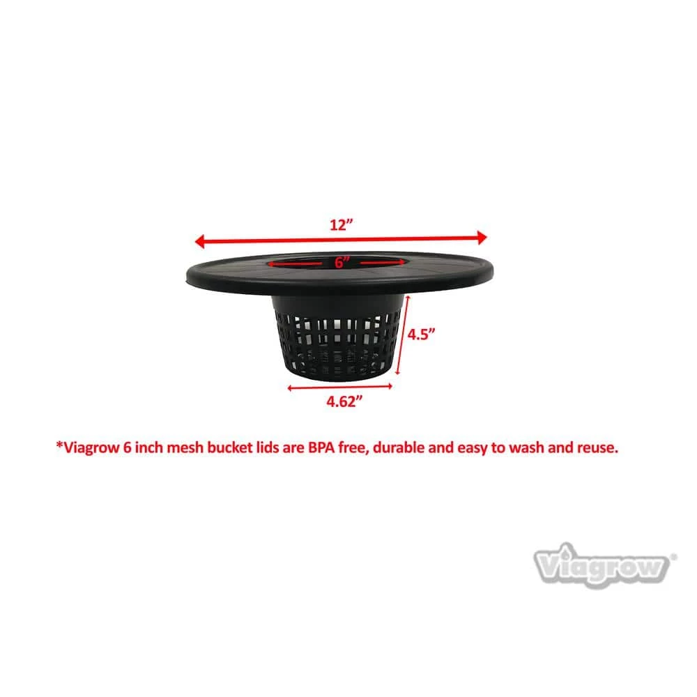 The Viagrow 6 in. heavy duty wide lip mesh pot bucket lid is designed to fit on standard 3.5 Gal. and 5 Gal. buckets. The 6 in. net cup bucket lids are great for all hydroponic applications as the mesh pot creates ample aeration for root development. In addition, the black opaque plastic will keep light out thus preventing algae from growing in your growing chamber. For ideal results use VS50 or VS10 Viastone grow rocks as your media in hydroponic applications.