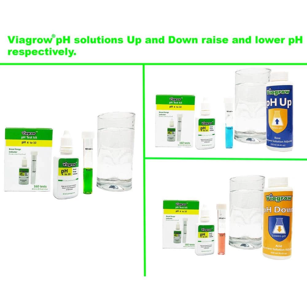 The Viagrow pH Test Kit comes complete with pH up & down liquid nutrient adjusting solution & is formulated using the highest food grade quality & includes a broad range pH Test Kit Which will indicate the pH value of your nutrient solution. While the liquid pH down solution uses food grade phosphoric acid & is safe for all food crops, the pH up uses food grade potassium hydroxide & is safe for all food crops. The Viagrow pH up & down are highly concentrated so less is needed for use as compared to most brands. Viagrow pH up & down can be used in all growing mediums – soil, soilless, hydroponics, or to adjust a foliar application. Maintaining a proper pH is an important part of growing healthy plants & Your broad range pH Test Kit will measure pH as low as 4 & as high as a value of 10 to grow the most vigorous plants maintain a slightly acidic pH in your choice of growing Media, It is recommended that the pH for most crops fall between 5.5 & 6.5 use moderately. Add 1 Drop of adjusting solution at a time to the plant nutrient solution & then test the pH. Repeat application & test again until appropriate pH level is achieved